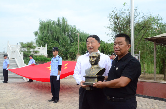 公司黨委書記、董事長王力民代表公司,接受紀念園負責人曹文濱代表紀念園捐贈的周恩來總理半身塑像。