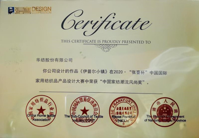 9月2日,以“潮流·生活”為主題的2020·“張謇杯”中國(guó)國(guó)際家用紡織品產(chǎn)品設(shè)計(jì)大賽頒獎(jiǎng)盛典在江蘇南通舉行。公司工業(yè)大麻材質(zhì)的家紡作品《伊普爾小鎮(zhèn)》,榮獲“中國(guó)家紡潮流風(fēng)尚獎(jiǎng)”。