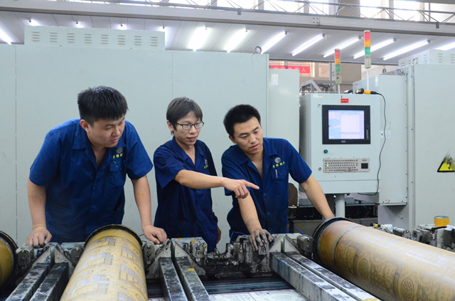 圖為輪班長張楠楠(中)與本班兩位印花機(jī)擋車工,在現(xiàn)場討論質(zhì)量改進(jìn)的情形。