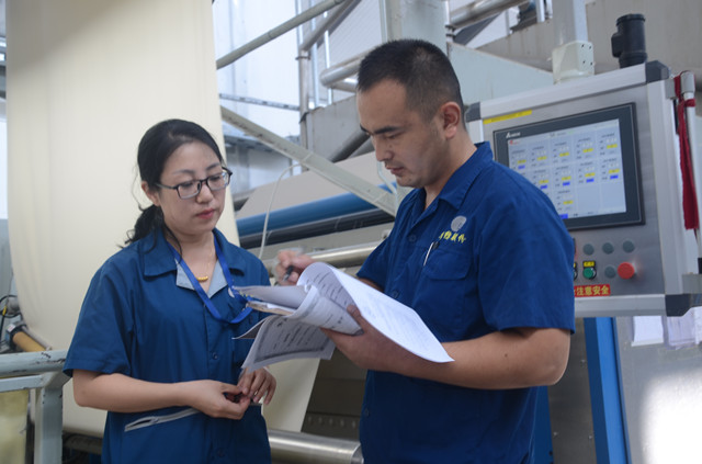圖為巡查人員盧敏捷(左)在與家紡車間340水洗機(jī)擋車工李正(右)落實(shí)、核對(duì)該機(jī)臺(tái)的維修及運(yùn)行數(shù)據(jù)。