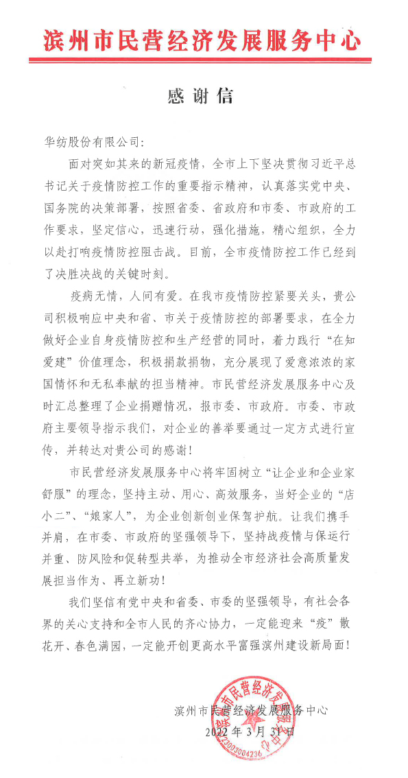 “疫病無情,人間有愛。在我市疫情防控緊要關頭,貴公司積極響應中央和省、市關于疫情防控的部署要求,在全力做好企業(yè)自身疫情防控和生產(chǎn)經(jīng)營的同時,著力踐行‘在知愛建’價值理念,積極捐款捐物,充分展現(xiàn)了愛意濃濃的家國情懷和無私奉獻的擔當精神……”這是3月31日濱州市民營經(jīng)濟發(fā)展服務中心發(fā)給公司感謝信中的一段話。