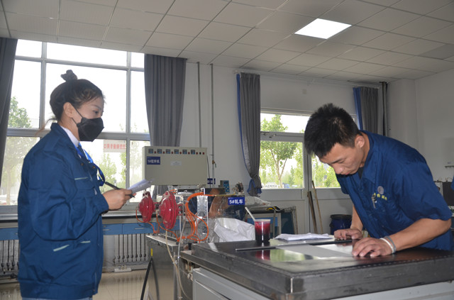 圖為4月26日公司對(duì)家紡車間化驗(yàn)室新員工進(jìn)行現(xiàn)場考評(píng)時(shí)的情形