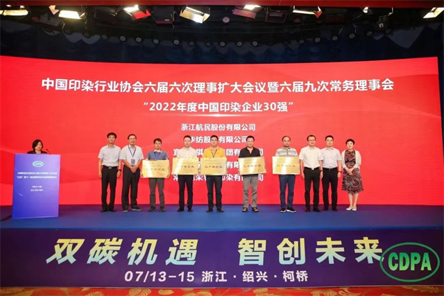 7月14日,中國印染行業(yè)協(xié)會(huì)六屆六次理事擴(kuò)大會(huì)議暨六屆九次常務(wù)理事會(huì)在浙江紹興召開。會(huì)上,中國印染協(xié)會(huì)發(fā)布了“2022年度中國印染企業(yè)30強(qiáng)”名單,公司以在多方面的綜合成效躋身這一行列。