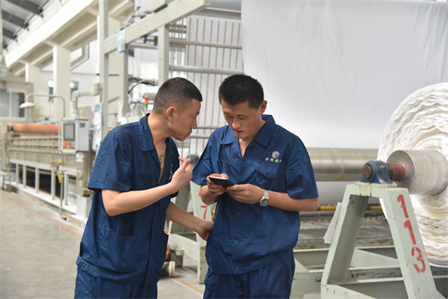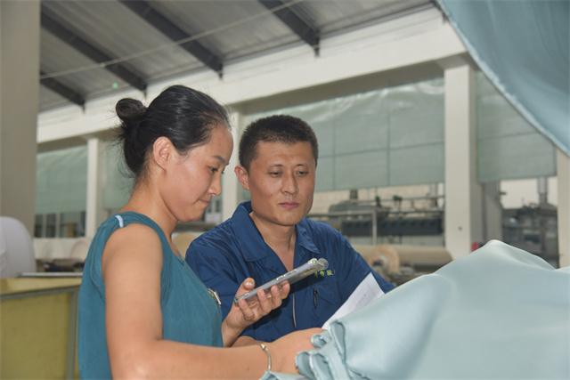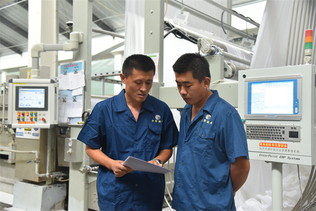 孫鎮(zhèn)身著工裝,每天巡回在車間前處理機(jī)臺(tái)之間,和暢的機(jī)聲成了他工作之時(shí)的伴奏。落實(shí)各機(jī)臺(tái)的計(jì)劃,組織各機(jī)臺(tái)生產(chǎn)跟進(jìn),管控本班的產(chǎn)品質(zhì)量,對操作規(guī)范進(jìn)行及時(shí)檢查、現(xiàn)場糾偏與指導(dǎo)培訓(xùn)。他一心撲在工作上,每天忙得不亦樂乎,目標(biāo)是帶領(lǐng)全班19名成員保質(zhì)保量地完成車間下達(dá)的任務(wù)目標(biāo)。他說,“做好生產(chǎn)工作有兩件法寶:一個(gè)是責(zé)任感,一個(gè)就是精益生產(chǎn)意識(shí)。”在孫鎮(zhèn)的心目中,作為公司的管理主線,精益生產(chǎn)需要全體“華紡人”共同傾心“打磨”,在時(shí)間里“磨”出真功夫來,干工作沒有捷徑,反復(fù)推敲,仔細(xì)琢磨;經(jīng)過工作實(shí)踐的摸爬滾打,才能提升自身本領(lǐng),才會(huì)使生產(chǎn)工作一步步精進(jìn)。