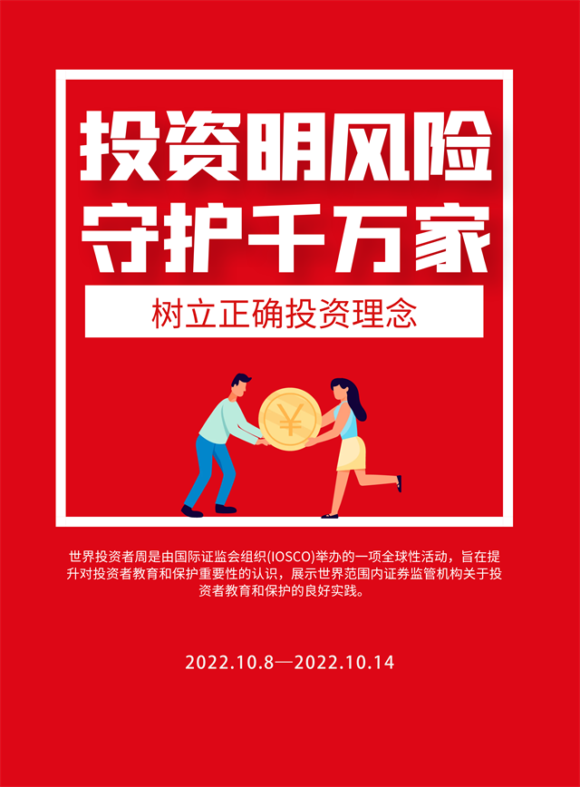 2022年“世界投資者周”將圍繞“投資明風(fēng)險(xiǎn),守護(hù)千萬(wàn)家”主題,向投資者普及《期貨和衍生品法》、普及綠色金融、綠色投資理念,引導(dǎo)投資者閱讀上市公司定期報(bào)告、踐行以信息披露為核心的注冊(cè)制理念,向投資者傳播金融證券知識(shí),提示投資風(fēng)險(xiǎn),增強(qiáng)理性投資、價(jià)值投資、長(zhǎng)期投資、風(fēng)險(xiǎn)防范意識(shí),引導(dǎo)投資者樹(shù)立正確投資理念。