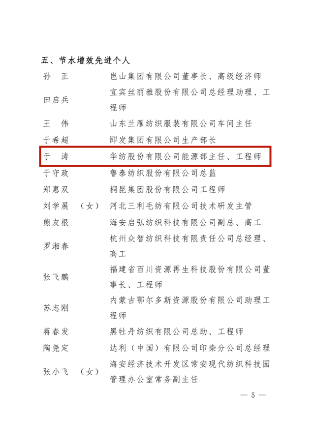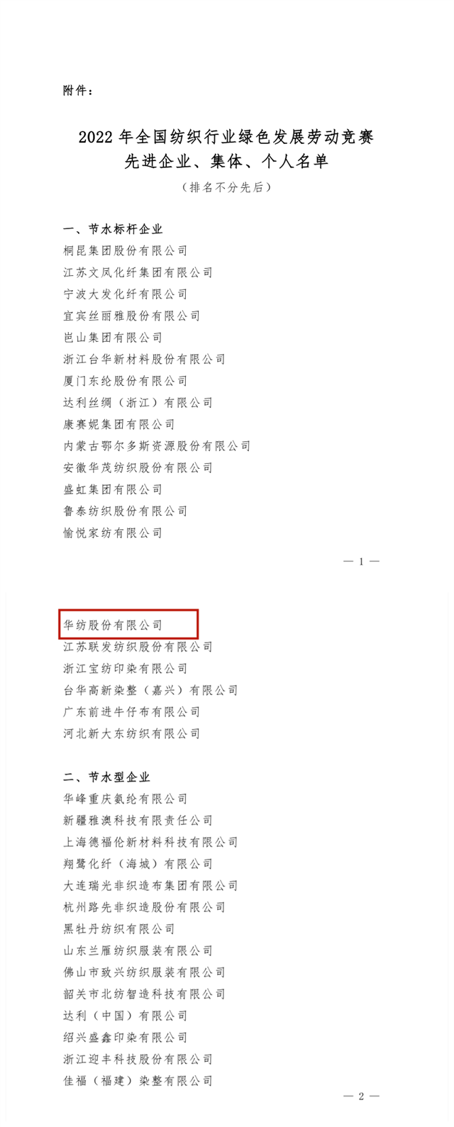 為大力弘揚(yáng)勞模精神、勞動(dòng)精神、工匠精神,組織引導(dǎo)廣大職工為推動(dòng)紡織行業(yè)綠色低碳循環(huán)發(fā)展貢獻(xiàn)智慧和力量。2022年,中國(guó)紡織工業(yè)聯(lián)合會(huì)與中國(guó)財(cái)貿(mào)輕紡煙草工會(huì)組織開展了涉及節(jié)水增效、節(jié)能降碳兩個(gè)領(lǐng)域的全國(guó)紡織行業(yè)綠色發(fā)展勞動(dòng)競(jìng)賽。在近日公布的競(jìng)賽結(jié)果的通報(bào)中,公司獲評(píng)“節(jié)水標(biāo)桿企業(yè)”榮譽(yù)稱號(hào)、公司系統(tǒng)工程部能源副總工于濤榮獲“節(jié)水增效先進(jìn)個(gè)人”榮譽(yù)稱號(hào)。