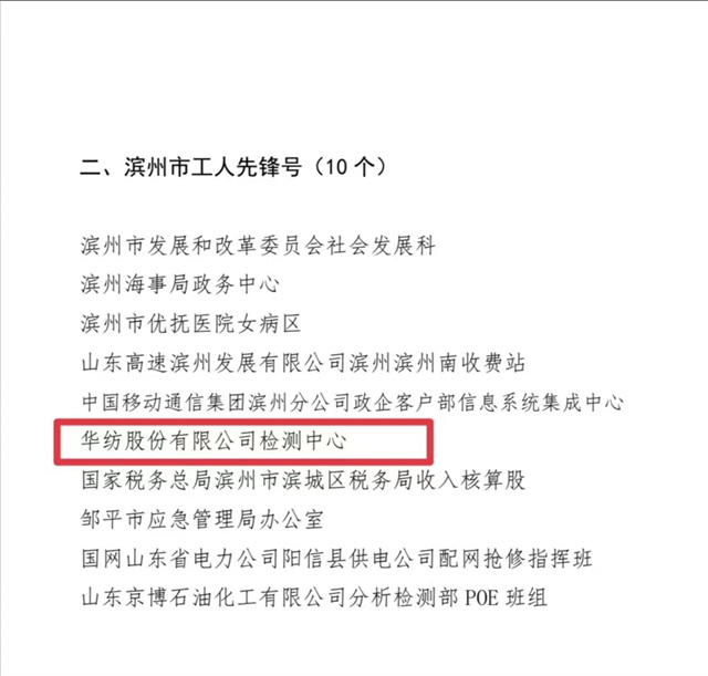 近日,濱州市總工會印發(fā)“關于濱州市五一勞動獎章和濱州市工人先鋒號的通報”,對華紡股份有限公司檢測中心等“濱州市十佳建功立業(yè)標兵崗”的集體,授予“濱州市工人先鋒號”榮譽稱號。
