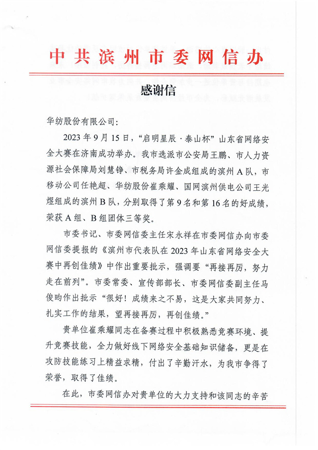 近日,公司收到一封來(lái)自濱州市委網(wǎng)信辦的感謝信,信中高度肯定了公司互聯(lián)信息部信息中心信息安全管理員崔乘耀在2023年9月15日“啟明星辰·泰山杯”山東省網(wǎng)絡(luò)安全大賽中所做出的突出貢獻(xiàn),信中指出:“貴單位崔乘耀同志在備賽過(guò)程中積極熟悉競(jìng)賽環(huán)境、提升競(jìng)賽技能,全力做好線(xiàn)下網(wǎng)絡(luò)安全基礎(chǔ)知識(shí)儲(chǔ)備,更是在攻防技能練習(xí)上精益求精,付出了辛勤汗水,為我市爭(zhēng)得了榮譽(yù),取得了佳績(jī)。”