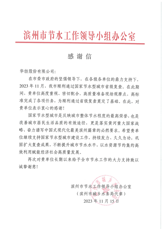 近日,濱州市節(jié)水工作領(lǐng)導(dǎo)小組辦公室向公司發(fā)來一封感謝信,信中指出:“2023 年11月,我市順利通過國家節(jié)水型城市省級復(fù)查。在此期間,貴單位高度重視、密切配合,高質(zhì)量準備現(xiàn)場觀摩點,高標準完成了各項任務(wù),為順利通過省級復(fù)查奠定了基礎(chǔ)。”