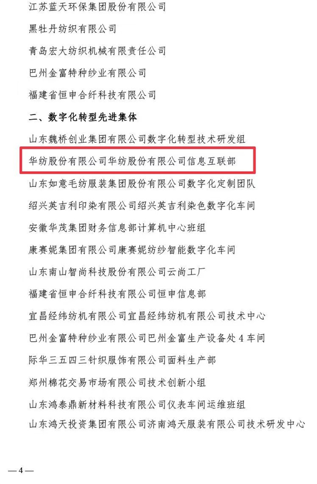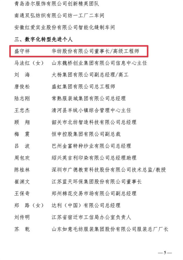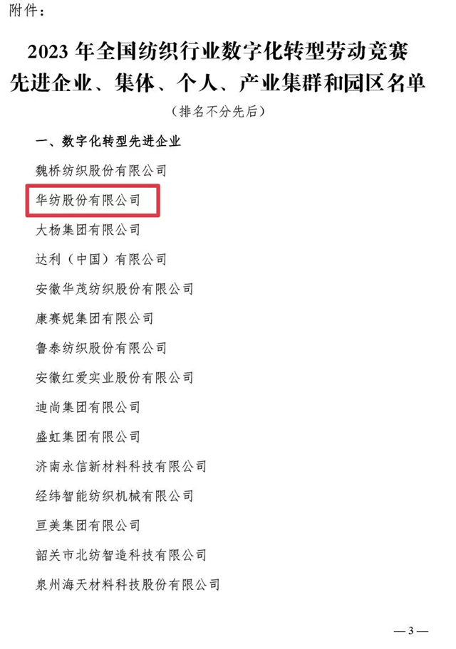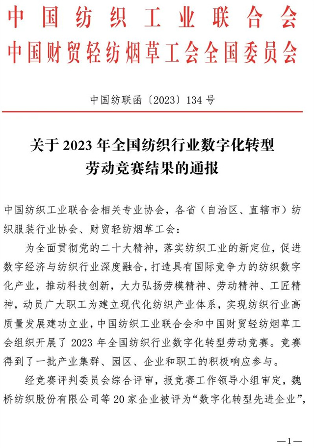 近日,中國紡織工業(yè)聯(lián)合會、中國財貿(mào)輕紡煙草工會全國委員會聯(lián)合發(fā)布了《關(guān)于2023年全國紡織行業(yè)數(shù)字化轉(zhuǎn)型勞動競賽結(jié)果的通報》,公司憑借2023年在數(shù)字化轉(zhuǎn)型方面的不斷探索與創(chuàng)新被評為“數(shù)字化轉(zhuǎn)型先進企業(yè)”,公司信息互聯(lián)部被評為“數(shù)字化轉(zhuǎn)型先進集體”,公司黨委書記、董事長盛守祥先生被評為“數(shù)字化轉(zhuǎn)型先進個人”。