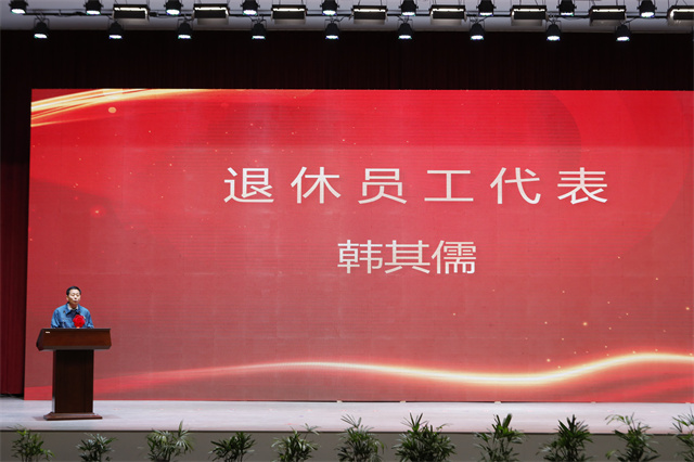 盛守祥為退休員工代表頒發(fā)榮譽(yù)證書,退休員工韓其儒代表80位退休同志做表態(tài)發(fā)言。