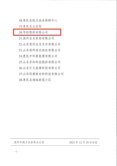 2023年,在全國紡織行業(yè)綠色發(fā)展勞動(dòng)競賽中,公司榮獲節(jié)水標(biāo)桿企業(yè);在濱州市創(chuàng)建國家節(jié)水型城市省級(jí)復(fù)查工作中,公司高質(zhì)量、高標(biāo)準(zhǔn)完成各項(xiàng)工作任務(wù),為順利通過省級(jí)復(fù)查奠定了基礎(chǔ)。