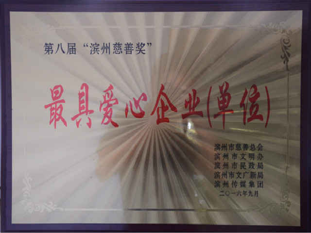 近日,由濱州市慈善總會(huì)、市精神文明建設(shè)委員會(huì)辦公室、市民政局、市文化廣電新聞出版局、濱州傳媒集團(tuán)等聯(lián)合舉辦的第八屆“濱州慈善獎(jiǎng)”評選表彰活動(dòng)圓滿結(jié)束,公司以對慈善事業(yè)的突出貢獻(xiàn),榮獲“最具愛心企業(yè)(單位)”稱號。