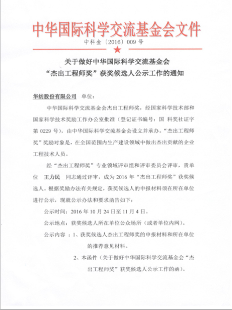 經(jīng)“杰出工程師獎”專業(yè)領(lǐng)域評審組和評審委員會評審,華紡股份有限公司王力民同志通過評審,成為2016年“杰出工程師獎”獲獎候選人。根據(jù)獎勵辦法有關(guān)規(guī)定,獲獎候選人的申報材料需所在單位進行公示。公示如下: