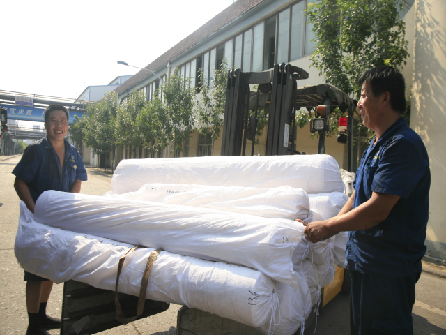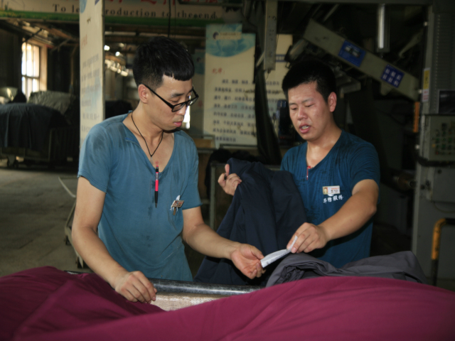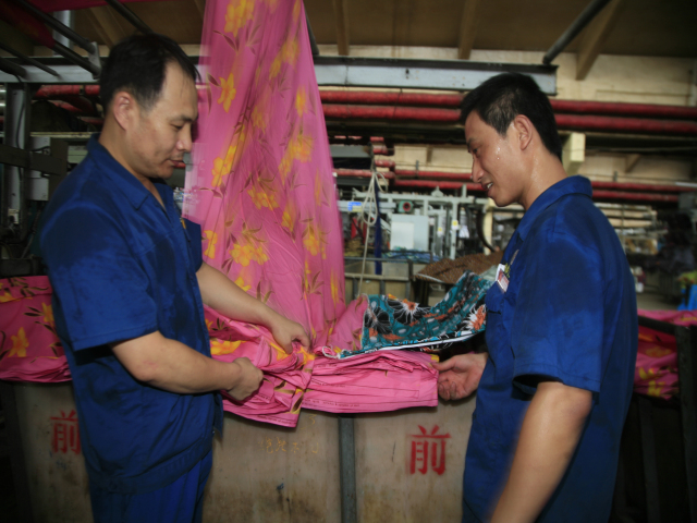 家紡車間前處理340絲光機(jī)出檢工李娟(圖左)與前來推布的360拉幅機(jī)進(jìn)檢工朱濤交接產(chǎn)品。李娟說:“天氣越熱,我們越要互相提示,注重細(xì)節(jié),保證安全,保證品質(zhì)。”