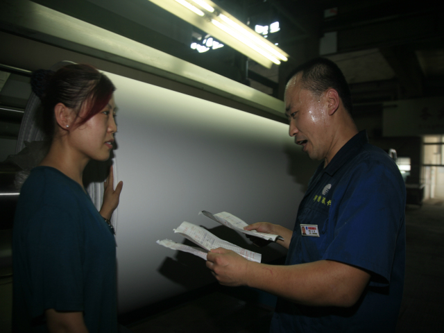 面三車間陳萬龍(圖右)在與本車間后處理預(yù)縮機(jī)機(jī)長王巖軍核對完試驗布數(shù)據(jù)后,說:“氣溫高,我們的勞動熱情更高!”
