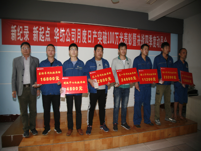 10月11日,公司召開主題為“新紀(jì)錄,新起點(diǎn),華紡公司月度日產(chǎn)突破100萬米表彰暨決戰(zhàn)四季度動員會”,會上對在9月份印染生產(chǎn)計劃完成工作中成績優(yōu)異的55個機(jī)組和41位個人進(jìn)行了表彰獎勵,對第四季度工作進(jìn)行了部署。
