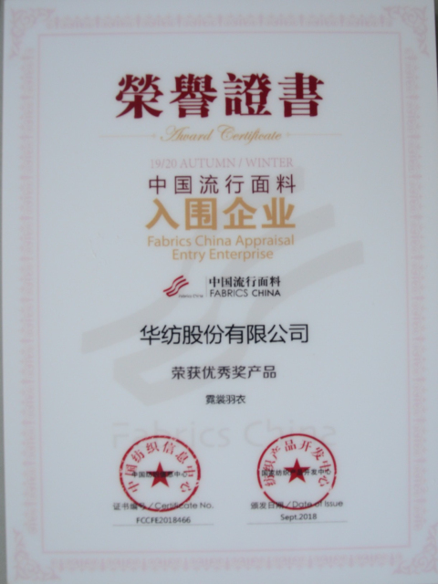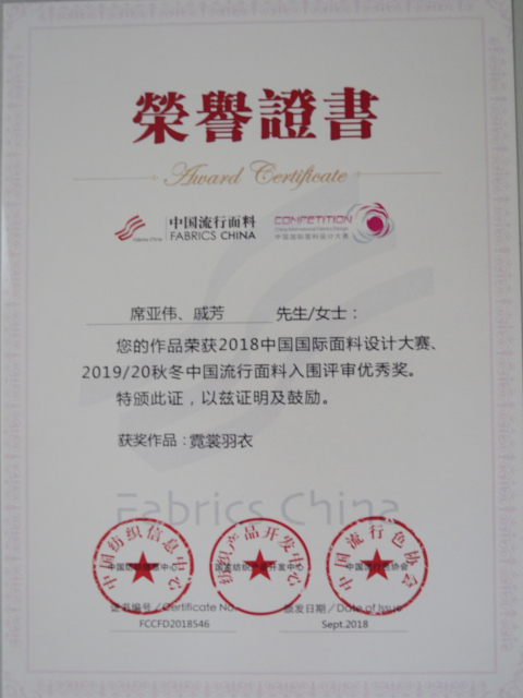 日前,公司在2018年中國(guó)國(guó)際面料設(shè)計(jì)大賽、第40屆(2019/20秋冬)中國(guó)流行面料入圍評(píng)審中再獲佳績(jī),被授予“2019/20秋冬流行面料入圍企業(yè)”稱號(hào),由席亞偉、戚芳設(shè)計(jì)的“霓裳羽衣”面料產(chǎn)品榮獲大賽優(yōu)秀獎(jiǎng)。